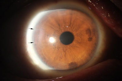 舊式白內障手術傷口較大(箭咀) 並需要縫針