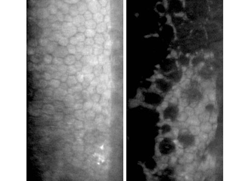 正常角膜內皮細胞 (左圖) ; 不正常退化內皮細胞(右圖)