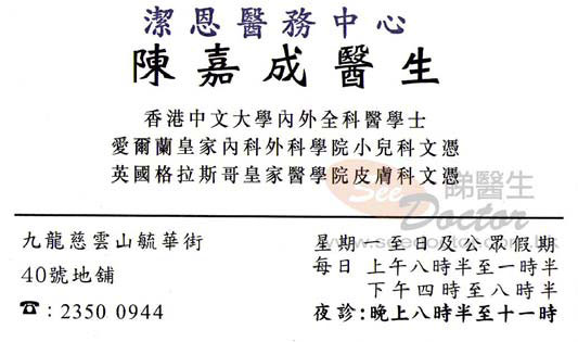 我家父因為患上急性風癩而急需求醫。慈雲山毓華街40號有3間診所連住,3間係星期日都有開門,左面同右面2間都爆滿,唯獨中間既陳嘉成醫生無人睇,情急之下就入左去睇。點知有個奇怪既$20登記費,爸爸因為年紀大忍唔住全身痕癢太辛苦,所以俾錢登記睇醫生。當日係由第二個陳醫生當席,佢hea hea地咁診症,好彩打左支針之後止左痕。因為當時本人不在場,又孤漏寡聞,對於聞所未聞既登記費傳有疑問,所以第二日打去診所問姑娘了解。我同第一位接線既姑娘講述情況同表明致電原因,佢叫我等等就交帶俾第二位姑娘。第二位姑娘接聽之後我再複述一次情況同致電原因,問佢點解要收登記費同登記費既作用係咩。個位姓邵既姑娘開始轉態,佢答話我呢到話要收登記費咪要收囉,咩作用咪問你攞張身份証幫你填資料囉。佢只係將我條問題用差既態度敘述左一次...丫 ,佢加多左句話如果我去政府醫院睇急症都要俾百幾蚊登記費wor。如果佢既條件比較係成立既話,我唔明點解間間診所都無收登記費唯獨係佢呢間要收,而且服務重要咁差tim wor.. 咁我得唔到個合理既解釋就更係再追問佢啦,點知佢態度越黎越差....佢突然問我爸全名,我以為有轉機佢會幫我俾個新既解釋我或安排退款咁啦。點知原來佢只係想起我底紀錄在案,再以我唔係病人本人為理由,叫我一定要帶埋阿爸過去佢診所先好再同佢傾,否則佢唔會再答我。我見佢都好惡咁同我講野同無誠意去令到件事愉快D,我就同佢遘唔該晒你丫byebye。佢就一句野都無講好無禮貌地cut線。我唔會勞煩年紀大重未完全好番既父親大人去搵德行有問題既醫生同護士去理論。