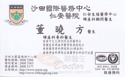因生育問題求診,董醫生詳細找出生育障礙原因,態度友善,成效高,值得推介。她每次都會體恤病人心情,甚至會主動減診金安慰病人。她的生育輔助技術手術一流,在手術過程中務求創造最佳受孕的環境,也經常保持與國際醫學發展的接軌,預約她一般要半年,但值得等待。仁安的護士團隊也十分專業。
