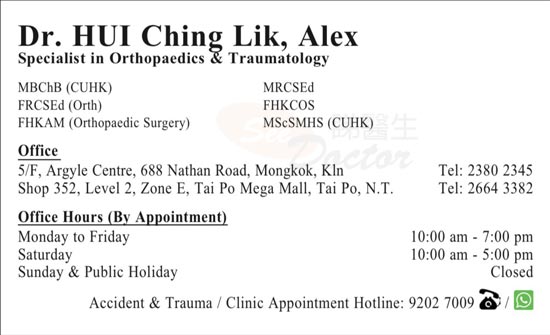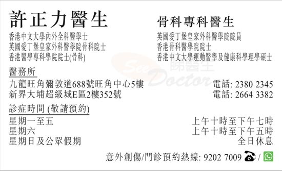 本人六十多歲,於去年開始,腳部不適,看過不少中西醫,都說是膝關節炎,或坐骨神經痛,但後來經MRI檢查,兩個部位都顯示沒有大問題,令本人十分困惑無助,不知道在哪裏才可以找到一位能幫到我的好醫生。後來經許醫生診症後,才知道自己是患髖關節炎(後來MRI檢查也證實了)。許醫生耐心解說,態度親切,令本人對病情更清楚明白,如果早些找到許醫生,便可減少求醫的冤枉路。診所姑娘也很體貼周到,十分用心服務病人。同層相鄰更附設物理治療師,配合許醫生診斷,為病人提供更整全服務。本人知道找好醫生不容易,許正力醫生是值得推介的好醫生 ,最近他剛在雅蘭中心一期1129室開設新診所(網上的地址有些還是舊的),希望他業務蒸蒸日上!
