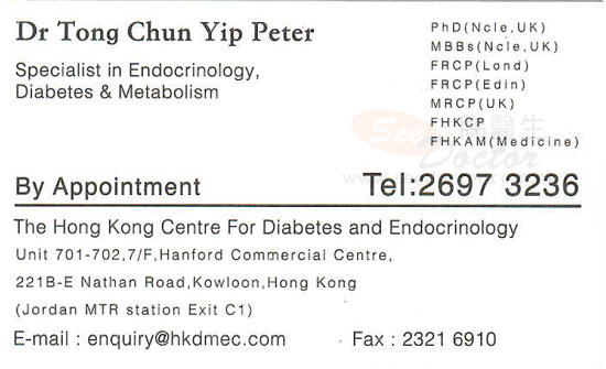 我父親已六十多歲,糖尿病已有二十年病史,因長期居住於國內,加上對自身病情未及重視,故血糖一直控制不到一個穩定合理的水平,去年在國內已有過一次輕微中風,頸動脈血管狹窄,幸得及時醫治,才有所康復。在香港查了好多醫糖尿的資料,也是看到這個網站上的評語,找到專科醫生唐醫生醫治。唐醫生詢問病情確實好詳細,身體檢查的也十分詳細,對待患者的態度也很有禮貌,耐心解釋,護士也都很客氣有禮貌,態度認真。還做了糖尿病併發症的詳細檢查(因在國內從未這樣詳細檢查過糖尿病)。詳細檢查後唐醫生給調整了降糖藥和胰島素針,說現在我父親所用國內的藥在香港好多年前已經禁用了。使用調整後的藥物一星期內的觀察結果,父親每天早晚的飢餓感下降了,不像以前那麼容易餓,吃的食物也遵照醫生的指示調整了些,血糖也比以前平穩好多,雖然還未達到最理想的水平,但比以前是理想太多。這和醫生詳細瞭解患者的病情加上合理的配藥是分不開的。雖然在香港看私家醫生是不便宜,但能很好的控制或治癒疾病還是值得推薦給各位的。所以唐醫生是名值得推薦給有需要人士的專科醫生。