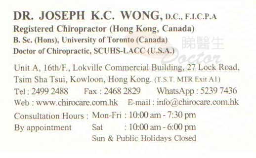 手指出現麻痹,經朋友轉介去了睇Dr Joe。手指公食指麻痹了一個月,開頭醫生話係腕管道綜合症,所以便佩戴一個護腕瞓覺,但是好似越大越麻痹,所以便開始擔心。Dr Joe解釋其實是頸椎出現問題,照了X光之後,看到頸骨有退化,骨同骨中間空間少了,所以壓住神經線。他為我矯正頸椎,再用衝擊波舒緩手臂及膊頭肌肉。他也教我做一套手麻痹運動。非常好有效。唯一投訴就是他太多病人,要預早約,但睇症都係準時的。