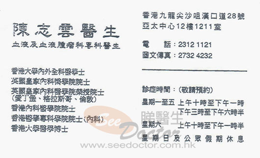陳醫生從前是東區醫院血液腫瘤科顧問醫生,富有經驗,診治本人時鉅細無遺,十分有耐心一一講解病情,醫德高尚,從病人經濟狀況著想,是一個難能可貴的仁醫。