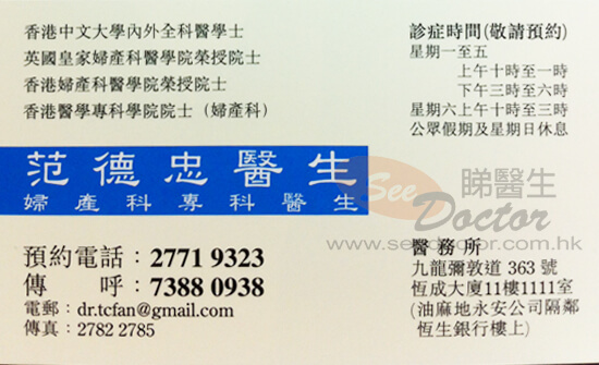 被經痛折磨多年, 分別試過避孕針及假收經針療程, 負作用骨質疏鬆(影響牙齒)及耳鳴.....!!! 療程完畢, 症狀慢慢變本再現, 經痛更甚, 經血量更多, 每日不停係咁痛, 試過兩日內共打8支針止血止痛, 痛苦萬分!!! 搞到無法正常生活, 工作大受影響!!! 真係人都癲!!! 身邊亦無人可問, 只有在網上不停找資料, 找到兩個專科醫生, 驗血指數甚高, 擔心是癌症, 佢哋同時話我不能做微創(因肌瘤已11cm), 所以未能下定決心, 總是猶豫, 但又十分害怕。後來睇到各方面對范德忠醫生的評價, 於是試約診症, 經他診斷後肌瘤確有11cm、他斷定不是癌症, 但他說我的情形係每日都會痛 (的確如此, 斷症準確), 同時他見到我帶來的病歷資料上寫有昂貴的檢查名稱, 他叫我無需浪費金錢做這些意義不大的檢查。此刻感覺眼前這醫生實在不可多得, 他從病人角度出發, 他用咗成個鐘頭講解我的病情及手術情況。 至慘我實在太亂, 好多都記不清, 回家後寫了一篇長長的電郵再問詳細, 范醫生都再次耐心一一解答, 終於令我踏出心理關口接受手術!!! 手術前幾日又氣管不適, 幸得范醫生教我如何處理。 手術日子終於到, 本來3小時多的手術, 因為子宮和腸黏連5 cm多, 范醫生非常非常小心逐 mm 逐 mm 割開, 花近5 小時完成手術, 化驗結果如他所說: 良性。 當晚肚皮上三個傷口只有微微痛, 下身一點痛都沒有, 第二日中午已落床及小便。 其間正站著同家人傾計時, 姑娘到來例行量血壓問: 病人唔見咗, 病人去咗邊? 我舉手話我係病人。 姑娘話: 你一點都唔似病人。 這都是多得范醫生精湛技術! 更甚是手術後因為私人問題心情極差, 范醫生都耐心安慰。 這樣的一個有技術、有醫德、有耐性又細心, 充滿慈愛的醫生, 又一次得以證實!!!