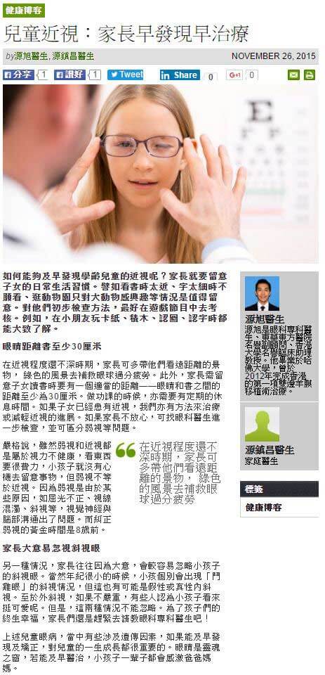 | 「這麼近看電視,你想戴眼鏡嗎?」這句說話,你有跟囝囝囡囡說過嗎?在香港,超過一半在學兒童有近視,而成年人近視的比率更高達8成。近視....... |