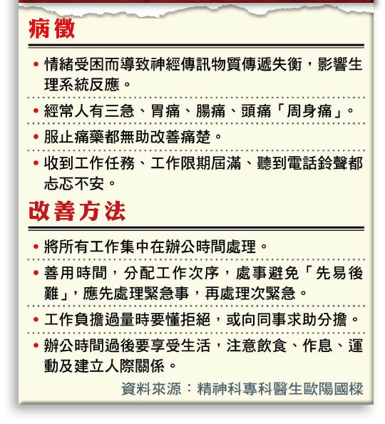 工作接踵而來要「趕死線」,放工仍然要留意電郵、手機短訊「藍剔」,忐忑不安,壓力「爆煲」易患心身症。有四十歲「打工仔」面對裁員令工作量大增,胃痛、腸痛久久未止,輾轉花了數以十萬計的金錢看十幾個專科醫生,多次做內窺鏡檢查都找不出病因,大半年後才發現是心身症作怪。精神科專科醫生指出,大部分心身症患者的病徵在各身體器官展現,比抑鬱症更難診斷及治療。