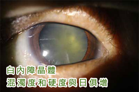 當晶體的混濁度和硬度與日俱增,逐漸影響光線到達視網膜,因而形成各種白內障的徵狀。