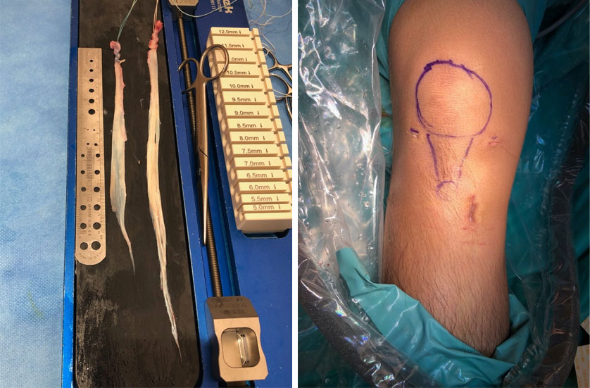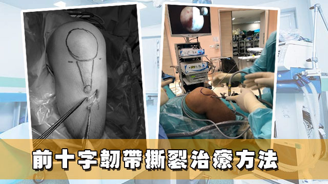 - 移除已撕裂的前十字韌帶,以髕骨肌腱或後大腿筋,移植到前十字韌帶位置,韌帶兩端分別以金屬栓和人工骨螺釘固定。