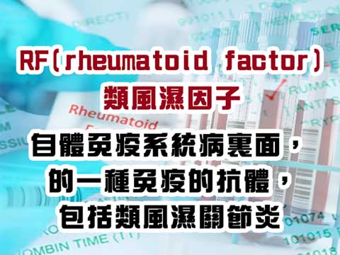 RF是類風濕因子(rheumatoid factor),是一種免疫的抗體,會出現在一些自體免疫系統病裏面,包括類風濕關節炎。在類風濕關節炎的患者裏,有七成的人都會有這個類風濕因子,但是都有三成的人是沒有這個因子。反而,有另外一個因子可以通過驗血驗到,就是CCP抗體。這個也可以代表患者是患上了類風濕關節炎。