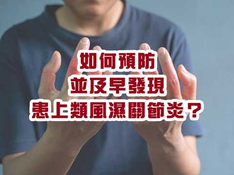 暫時來説,除了吸煙這個因素之外,其他的因素都很難去避免,所以是很難去預防患上類風濕關節炎。不過,可以及早發現類風濕關節炎。如何及早發現呢?如果發覺自己有一些初期類風濕關節炎的病徵,例如:超過三個關節都有發炎、腫痛,或者有晨僵(意思就是早上起床後,關節的活動不自如、很僵硬)的情況,這些都可能是早期的類風濕關節炎的病徵。患者就可以快點去看醫生,就可以及早發現、及早醫治。