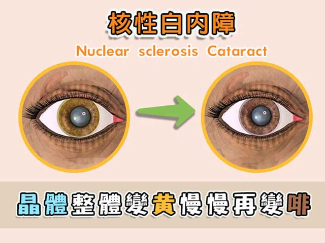 這種白內障顧名思義,是由核心起的一種退化,導致整個整體變黃,再繼而變啡,令到整個晶體變得慢慢不再清澈。初期,病人可能會留意到近視度數加深,繼而慢慢留意到晚間視物較為辛苦,這是因為瞳孔縮小再加上晶體透光度差了的緣故。