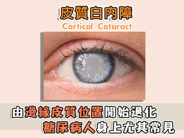 這種白內障變化由邊緣皮質位置開始退化,於糖尿病人身上尤其常見。打個比喻,這種白內障像眼鏡鏡片花了,會將光打散。病人自身可能會留意到視力差了,尤其是在猛烈陽光底下。奈何驗視力的時候不一定可以找出問題,這是因為晶體中心位置未受影響。