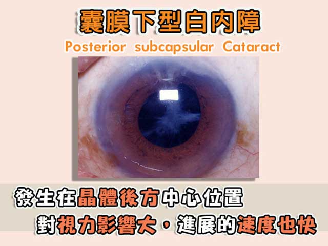 這種白內障最是來勢洶洶,因為起變化的位置是在晶體後方中心位置,那裡是光線經集中後,開始進入眼球後方的必經要點。不但對視力影響大,進展的速度也快,這種白內障假如不放大瞳孔檢查的話,很容易被忽略,因為相對前述兩種白內障,它影響的範圍小很多。