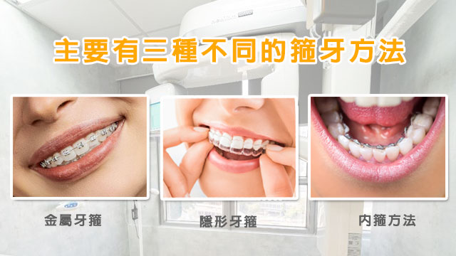 目前主要有三種箍牙方法,傳統牙箍主要分為兩種,第一種是最傳統的金屬牙箍,採用不銹鋼「牙釘」;第二種是內箍方法,主要將牙箍固定於牙齒內側表面,不為外人察覺。第三種是近年較流行、外形上較美觀的隱形牙箍,是透過3D掃描技術將患者牙齒排列影像傳送到電腦,再由牙科醫生設定最適合患者的牙齒位置及移動過程,之後用壓模技術製成牙套。