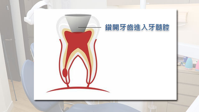 3. 鑽開牙齒:從牙齒表面鑽孔以接觸牙髓。前牙會由牙齒的背面鑽孔,而臼齒則從咀嚼面鑽入。