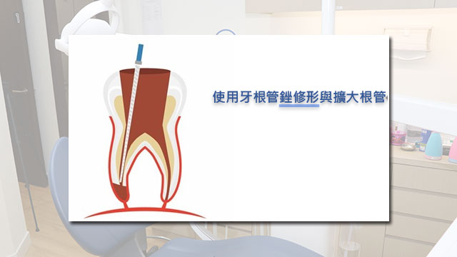 5. 根管修形:測量牙根深度,如有需要會使用牙根管銼做適當的修形與擴大,以提供根管充填的空間,確保填充物可以到達牙根尖端。