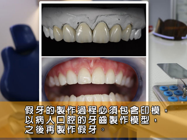 根據每位病人複雜的情況,醫生會作出適當的調整而作出指示,把牙模送返工場並由牙科技師以精準及細膩的手工,依照醫生的指示去修改製作假牙,再由醫生檢驗及為病人進行試帶測試,最後製作好可以陪伴病人咀嚼很長一段時間的一副假牙。