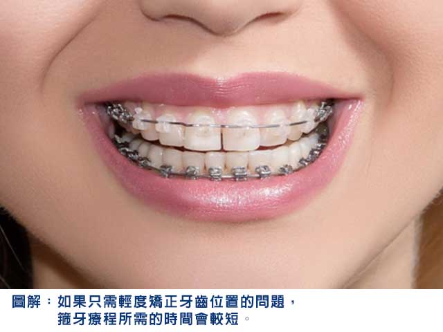 如果只需輕度矯正牙齒位置的問題,例如輕微擁擠或牙齒之間的牙罅問題(例如進食時經常會攝食物殘渣或因牙齒之間的罅隙出現黑色陰影),箍牙療程所需的時間會較短。