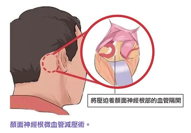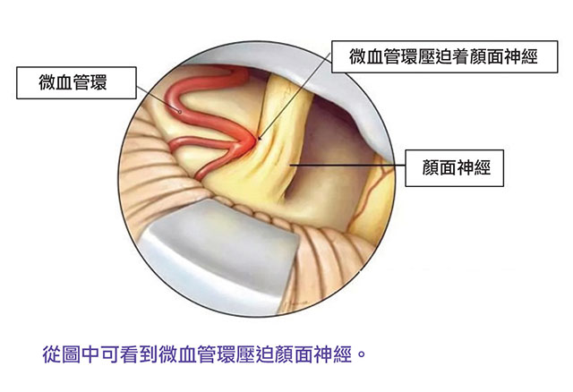 在顯微鏡手術下,腦神經外科醫生發現病人的神經線和血管附近可能曾經發生炎症,導致血管和神經線黏連在一起。在4個多小時的顯微鏡手術下,醫生小心翼翼地將壓着顏面神經根的血管環分開,清除了導致神經短路而錯發訊息的原因。醫生接着再用人造海棉(Teflon)將神經線和血管永久阻隔,手術過程中醫生亦要小心保護張女士其他的腦神經和血管,例如聽覺神經,避免她有失聰的風險。手術後,張女士的眼瞼和面部神經抽搐現象即時消失,手術後兩天便回家休息。多年以來她不需要服用任何藥物或注射治療,眼瞼面部抽搐痙攣的問題不曾復發,病症得到了永久根治。