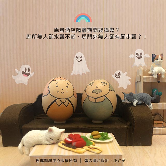 鬼節少不了要談及鬼故事,張正平醫生在此亦為大家分享兩則患者懷疑「撞鬼」實錄。他指,曾接見一名30多歲男患者,對方剛從外國返港,安排酒店接受隔離。他在隔離一星期後,開始出現奇怪現象。他經常聽到房間廁所有水喉聲及沖廁聲,當走進廁所時卻發現水喉及馬桶均沒有異樣。類似事件不斷重複發生,後來更開始聽到門外有腳步聲,慢慢由門外傳至廁所內,但當他打開房門時,卻沒有發現任何人。這些情況逐漸使他感到惶恐不安;有時候,他甚至聽到有不同的聲音在竊竊私語。他嘗試跟酒店職員尋求協助,但經過檢查均沒有發現異樣。