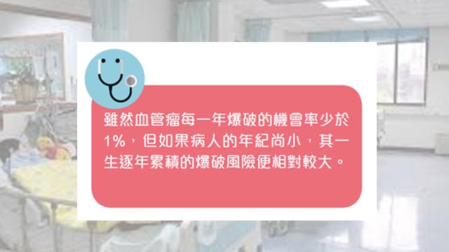 (3) 出血性中風:先天性腦動靜脈畸形血管瘤患者以女性較多,涵蓋的年齡層廣泛,由4歲小童以至80多歲的老人家也有。雖然腦動靜脈畸形血管瘤每年爆破的風險少於1%,但它卻是兒童、年輕人、孕婦、身體健康人士出血性中風的主因之一,病發者多數處於10多歲至40多歲的年齡層。患有先天性腦動靜脈畸形血管瘤的人通常由小到大都沒有任何症狀,直至血管瘤爆破時才有劇烈頭痛、頭暈、噁心、嘔吐、神經功能失調、意識混亂、癲癇症發作,甚至昏迷的緊急症狀。