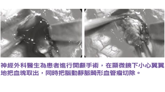 於是醫生為陳小姐進行了微創開顱手術,利用導航系統及術中持續監測腦功能系統,在顯微鏡下醫生小心翼翼地把血塊取出,為陳小姐腦部進行減壓,同時把腦動靜脈畸形血管瘤切除。手術後,患者的右腿力度回復正常,可正常行走,其後和兒子移居到澳洲生活,多年來活動如常。