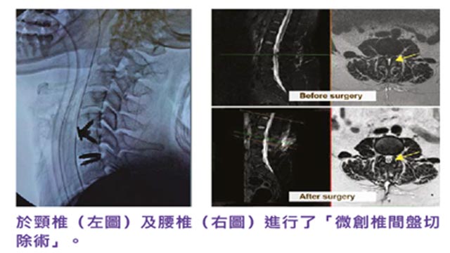 問題疑團明朗化後,醫生便為患者進行了三個微創手術:第一和第二個手術分別於他的頸椎和腰椎都進行了「微創椎板切除術和神經減壓術」,最後第三個手術就是把之前植入的腦脊液引流器閉塞,防止不必要的腦脊液繼續排出而導致腦低壓性頭痛症狀。