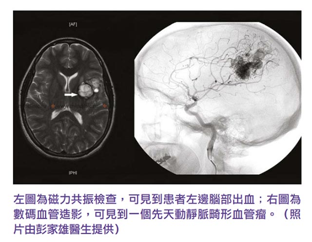 案例一: 腦動靜脈畸形血管瘤破裂出血 在9月初,40歲的陳女士與家人到湖南旅遊, 在當地駕駛途中突然感到劇烈頭痛,隨即與家 人乘坐高鐵返回香港求醫。回港後,醫生馬上 為陳女士安排磁力共振(MRI)檢查,檢查結 果顯示,陳女士腦內有一個腦動靜脈畸形血管瘤(AVM),而且有破裂出血的現象,需要立 即進行緊急開顱手術。手術期間,陳女士曾經 流失6公升的血,血壓更微弱至幾度探測不到。 經過8小時的緊急手術,神經血管外科醫生在 顯微鏡下,為陳女士徹底切除血管瘤和去除瘀 血,在醫院休養一段時間後便出院了。