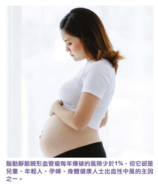 腦動靜脈畸形血管瘤是一種先天性的疾病,致 病原因不明,亦沒有遺傳基因導致。當患者仍 是胎兒,在母親體內腦部發育時,動靜脈畸形 的問題已經形成。患者以女性較多,其涵蓋的 年齡層廣泛,由4歲小童以至80多歲的老人家都 有。雖然腦動靜脈畸形血管瘤每年爆破的風險 少於1%,但它卻是兒童、年輕人、孕婦、身體 健康人士出血性中風的主因之一。大多數患者 由出生到血管瘤爆破之前,都沒有任何症狀, 直至血管瘤爆破時才有劇烈頭痛、頭暈、噁 心、嘔吐、神經功能失調、意識混亂、癲癇症 發作,甚至昏迷的緊急症狀。