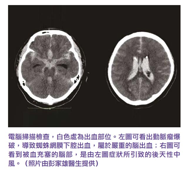 案例二、三: 突然爆破的腦血管動脈瘤 9月中,有兩位分別是35歲的林先生及52歲的 程女士,他們便沒那麼幸運了。兩位一向飲食 健康,亦不時做適量運動,由於事發前並沒有 病徵,因此他們都沒有做過任何腦部檢查。直 到動脈瘤突然破裂才感到劇烈頭痛、頭暈,其 後更急速昏迷休克被送入醫院。 電腦掃描影像顯示,林先生和程女士的腦內都出 現嚴重出血性中風的跡象,神經外科醫生仔細查 看影像時,發現兩位都是因為腦血管動脈瘤破裂 而導致嚴重出血性中風,而且林先生的動脈瘤近 於腦幹位置,被送入院時已經有瞳孔放大的情 況,最後兩位都在一、兩天後不幸離世。