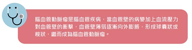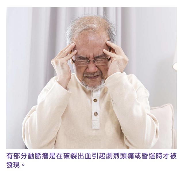 大部分的腦動脈瘤都很少有明顯的病徵症狀, 一般人很難發現自己有一顆計時炸彈埋藏在腦 內,近年也愈來愈多人在身體檢查時發現患有 此病。有部分動脈瘤是在破裂出血引起劇烈頭 痛或昏迷時才被發現,另一部分則是在瘤體變 大後壓迫神經引起一系列症狀(如複視或眼瞼 下垂)時被發現。腦血管動脈瘤一旦破裂,可 在瞬間奪去患者的生命,約30%病人在來不及 送抵醫院前已經失救死亡,30%病人很可能有 神經損傷後遺症。研究發現在1年以內,25顆 動脈瘤中會有1顆破裂,也就是大約4%。 正因為此症不易被察覺,預早防範和及時的診 治顯得更為重要。若腦血管動脈瘤能早期發 現,同時得到適當的監察及治療,就可避免因 腦血管動脈瘤突然破裂而引起的生命危險。