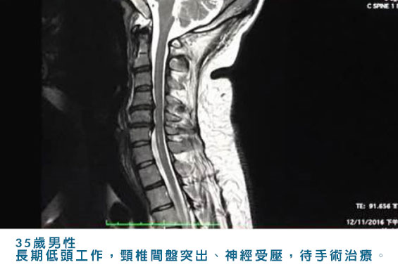 但隨着低頭族頸部長期勞損及人體自然的老化退化,椎間盤會失去水分,就如同輪胎漏氣一樣,失去緩壓吸震的原有功效。當輕微受傷時,椎間盤周邊的保護纖維環會撕裂, 猶如車胎爆裂般導致位於椎間盤中心的凝膠狀結構突出並壓迫脊髓或神經。隨着年齡增長椎間盤失去緩壓吸震功效,會加重頸椎節骨間磨損的情況導致骨刺這類病理變化,骨刺亦會壓迫脊髓或神經。
