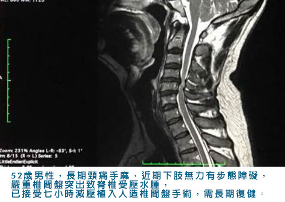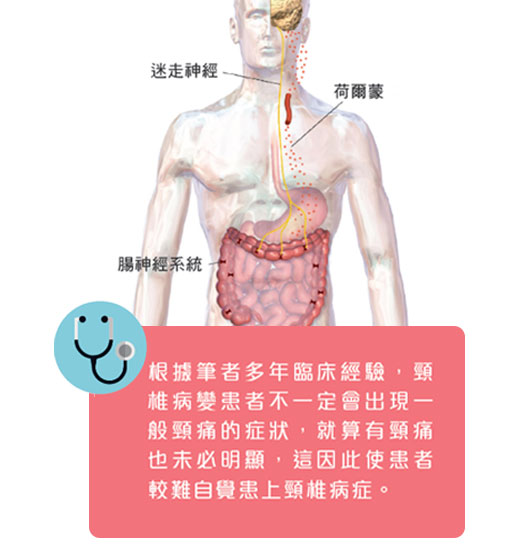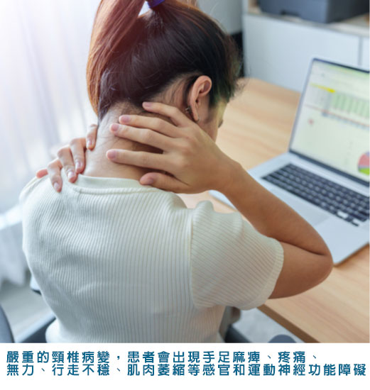 總的來說,頸脊髓作為大腦和身體周邊神經的關鍵通路橋樑,任何頸椎病變都可能影響脊髓傳遞神經訊號的功能,從而引發神經系統相關的症狀。由於頸脊髓控制着四肢的運動和感覺,所以嚴重的頸椎病變例如椎間盤突出、骨刺或腫瘤,導致神經根或脊髓中樞受到壓迫, 患者就會出現運動神經或感官神經的傳統症狀,包括手足麻痺、疼痛、無力、行走不穩、肌肉萎縮等感官和運動神經功能障礙。另外患者亦可能同時有血壓高、心率異常、消化不良等非自主神經、交感神經或迷走神經功能失調的表現。