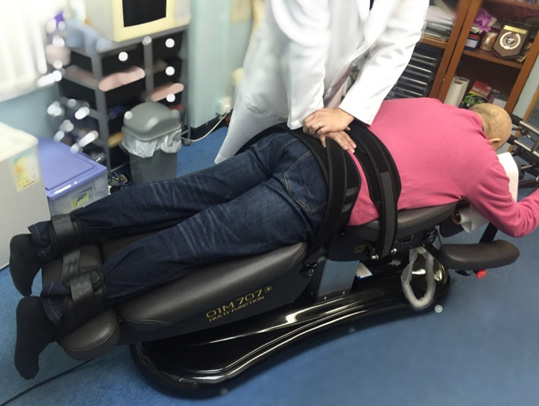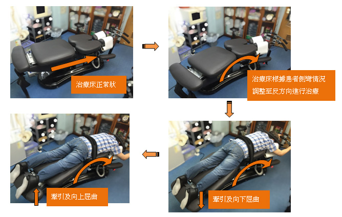 根據患者的側彎方向,利用專業脊醫治療床的牽引及向左右屈曲(Lateral Flexion)之方式做反方向側彎治療。