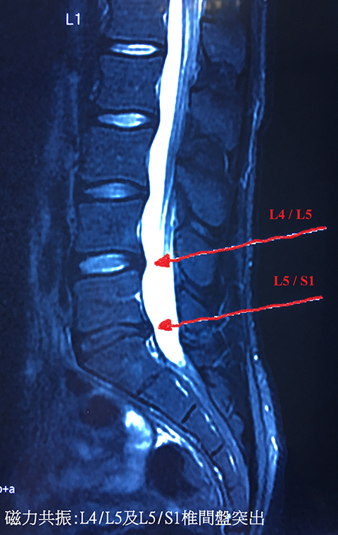 2014年3月,我去睇神經科醫生,再照磁力共震,腰椎L4、L5椎間盤及L5、S1椎間盤突出,突出大概3.5mm及4mm,壓住L5神經線,腰患惡化。醫生同我講,你咁多年冇去處理冇去醫,惡化係非常正常。醫生提議手術方案或注射類固醇入脊椎止痛,我選擇後者,諗住可以極速唔痛。打針後,我感覺如重生一樣。