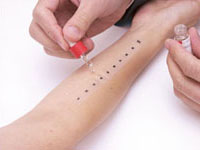 皮膚點刺測試 把小量過敏原刺入有豐富過敏細胞(肥大細胞)的皮膚表層。如果病人對過敏原敏感,測試範圍會出現腫脹和發紅的徵狀。皮膚測試須由專科醫生監督下進行,以免出現副作用。